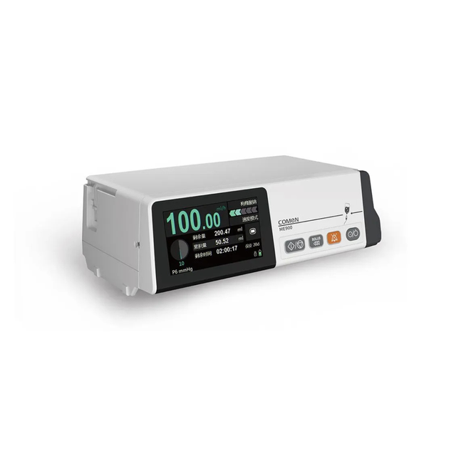 Bomba de infusión volumétrica Comen ME900 con pantalla táctil TFT-LCD a color de 3.5″, múltiples modos de funcionamiento (velocidad, tiempo, peso, micro, secuencial, etc.) y monitoreo dinámico de presión. Precisión y control en tratamientos prolongados. Compatible con sets de 10 a 60 gotas/mL.
